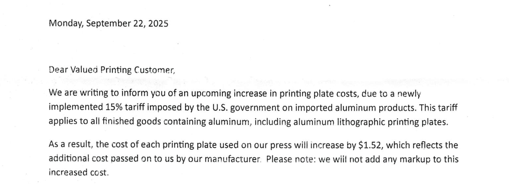 We are writing to inform you of an upcoming increase in printing plate costs, due to a newly implemented 15% tariff imposed by the U.S. government on imported aluminum products. This tariff applies to all finished goods containing aluminum, including aluminum lithographic printing plates.